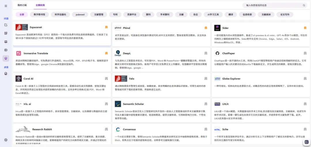 集成辅助科研、学习的应用工具,支持按分类查看AI应用,支持点击一键跳转使用,支持收藏到我的应用,并通过首页快捷访问。