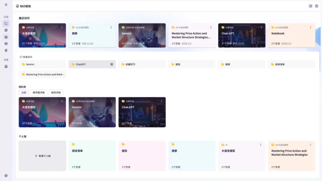【团队知识链】:支持团队成员共享知识星链内容,支持课题组管理团队成果,可进行上传或者检索资源。