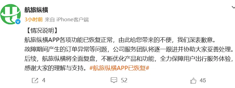 崩了近20小时后,航旅纵横APP功能恢复正常,故障期间的订单异常等问题将逐一协助处理