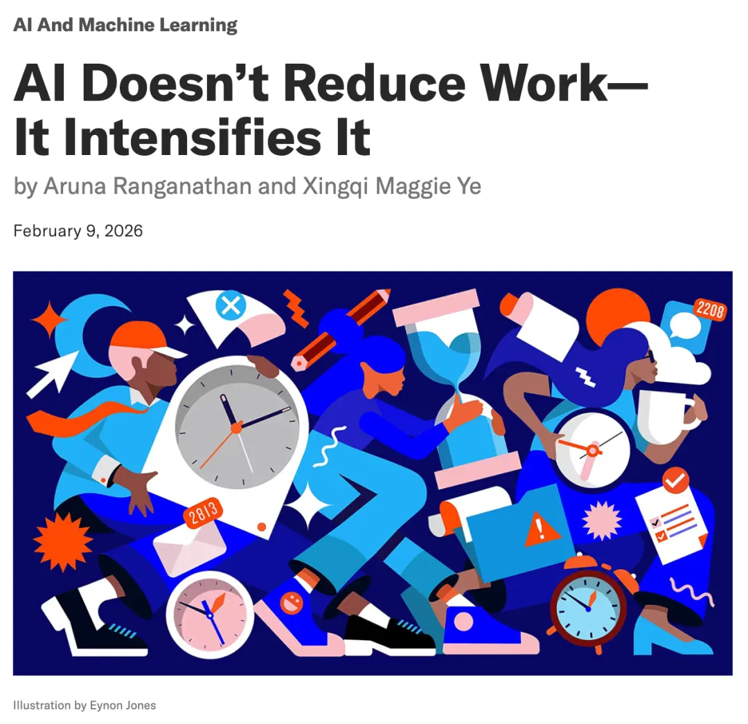 One of the promises of AI is that it can reduce workloads so employees can focus more on higher-value and more engaging tasks. But according to new research, AI tools don’t reduce work, they consistently intensify it: In the study, employees worked at a faster pace, took on a broader scope of tasks, and extended work into more hours of the day, often without being asked to do so. That may sound like a win, but it’s not quite so simple. These changes can be unsustainable, leading to workload creep, cognitive fatigue, burnout, and weakened decision-making. The productivity surge enjoyed at the beginning can give way to lower quality work, turnover, and other problems. To correct for this, companies need to adopt an “AI practice,” or a set of norms and standards around AI use that can include intentional pauses, sequencing work, and adding more human grounding.