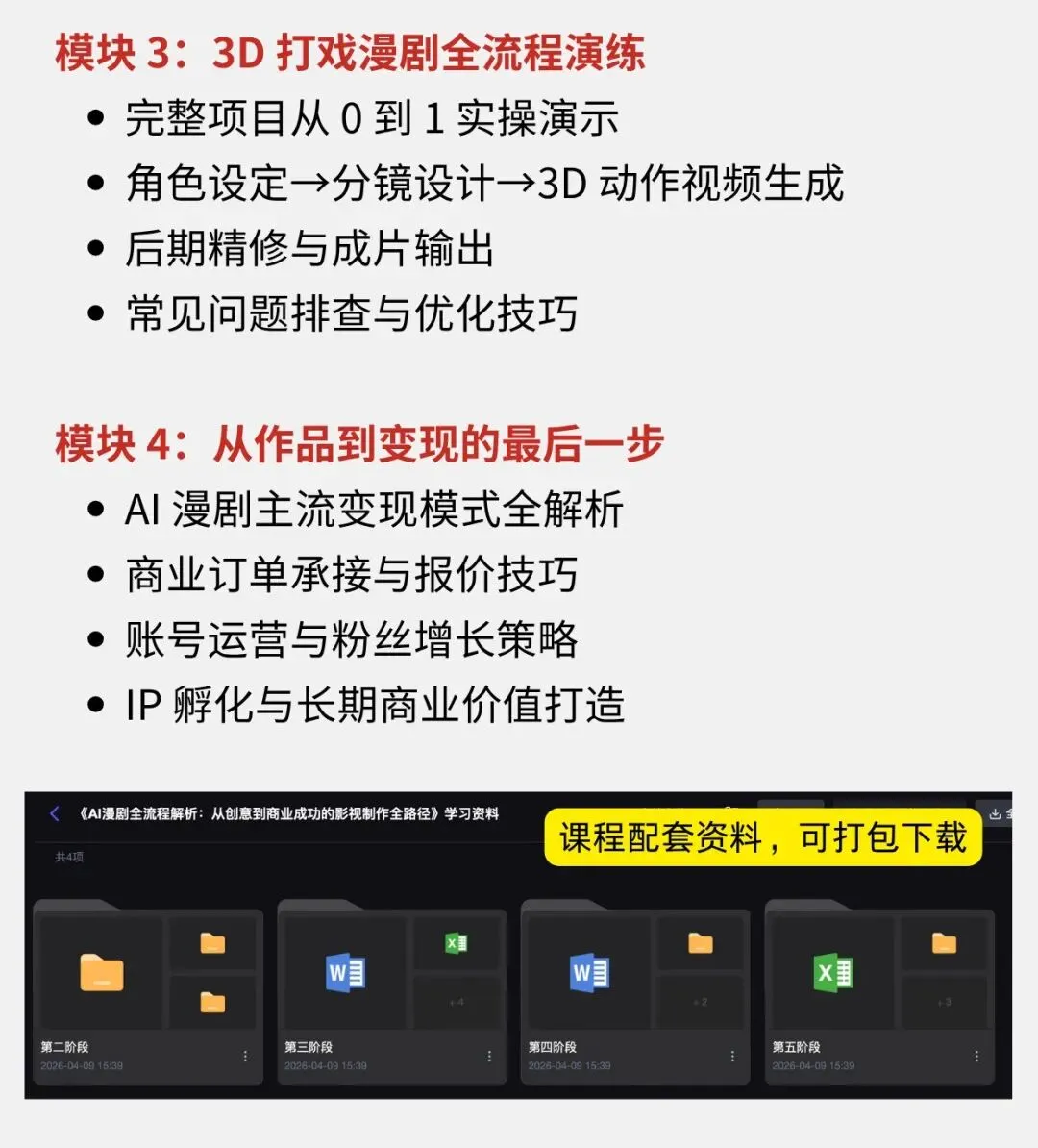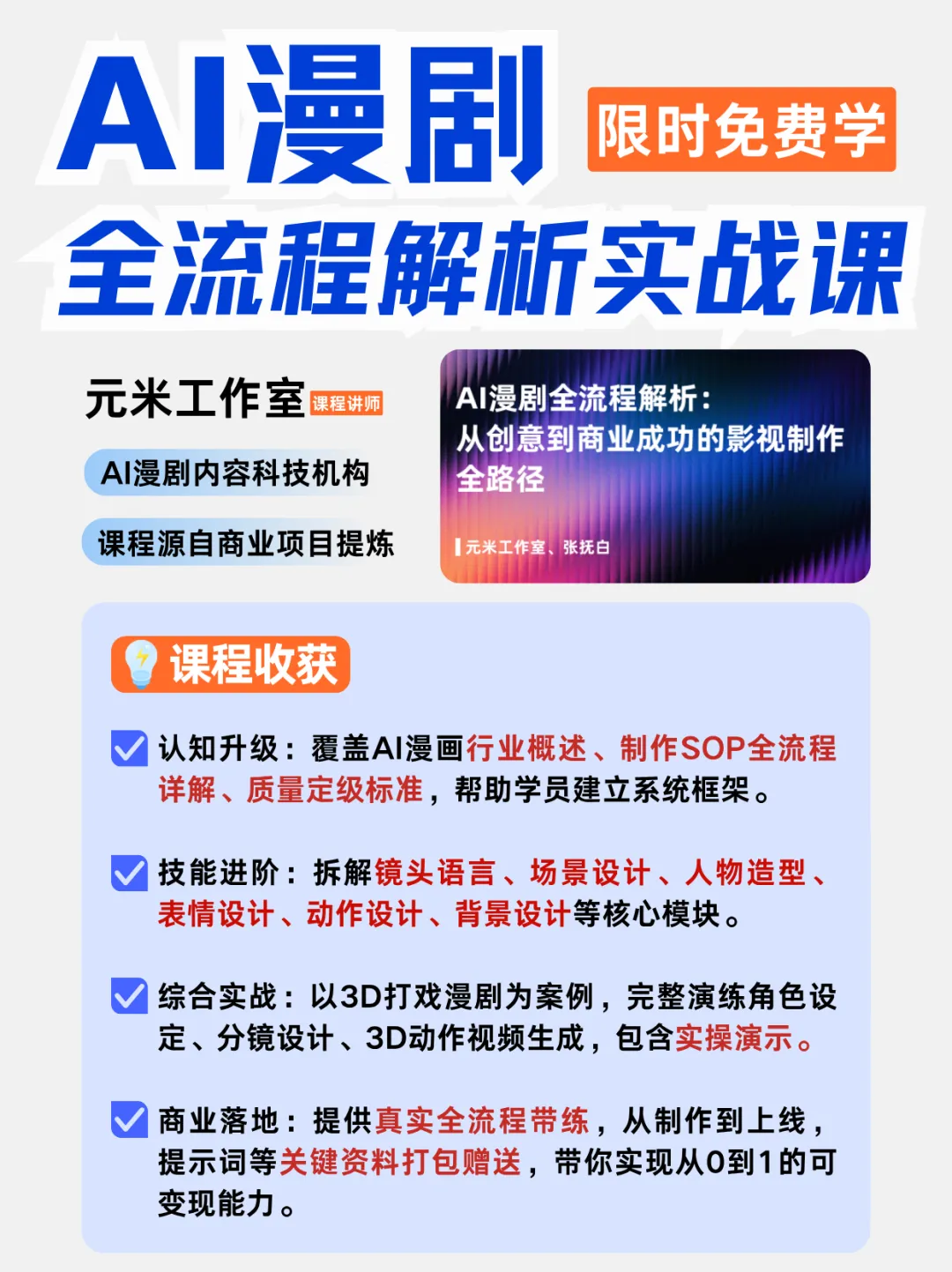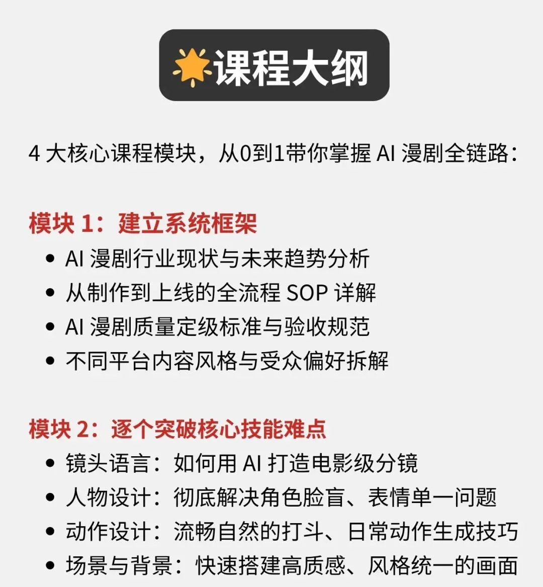 课程共计4大模块,从“基础认知👉技能要点👉商业实战👉工业化SOP”,带你从0-1掌握AI漫剧制作全链路!