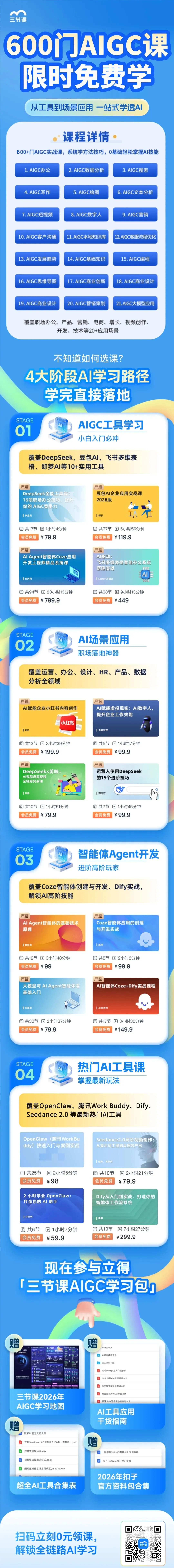 内容覆盖 “AI 办公、AI 产品、AI 营销、AI运营、AI 开发” 等20+应用场景,从基础操作到高阶技巧,从工具使用到创意落地,全面覆盖。