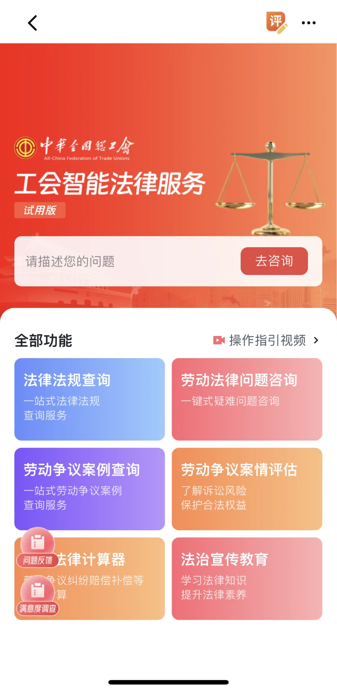 “职工之家”APP上线了基于人工智能大模型的智能法律服务,整合了劳动关系领域5000余部法律法规和规范性文件,收集典型劳动争议案例上万个,提供了24小时法律法规查询、劳动法律问题咨询、劳动争议案例查询、劳动争议案情评估、劳动法律计算器等服务功能。