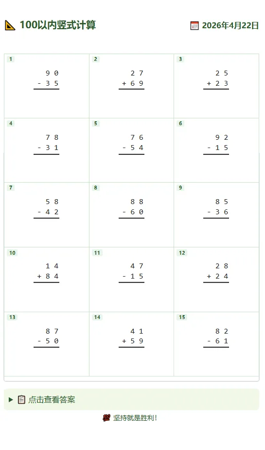 下面是我生成的100以内竖式计算,为了调试能自己想要的格式和样子,一点一点的跟DS沟通,修改,最后又用豆包修改了一点小细节,终于达到我想要的样子了。