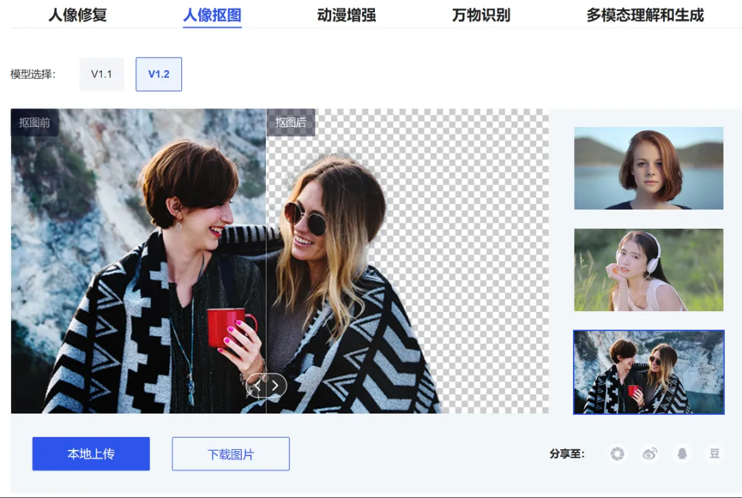 多功能集成:除抠图外,还提供老照片修复、画质增强、图像上色等实用功能