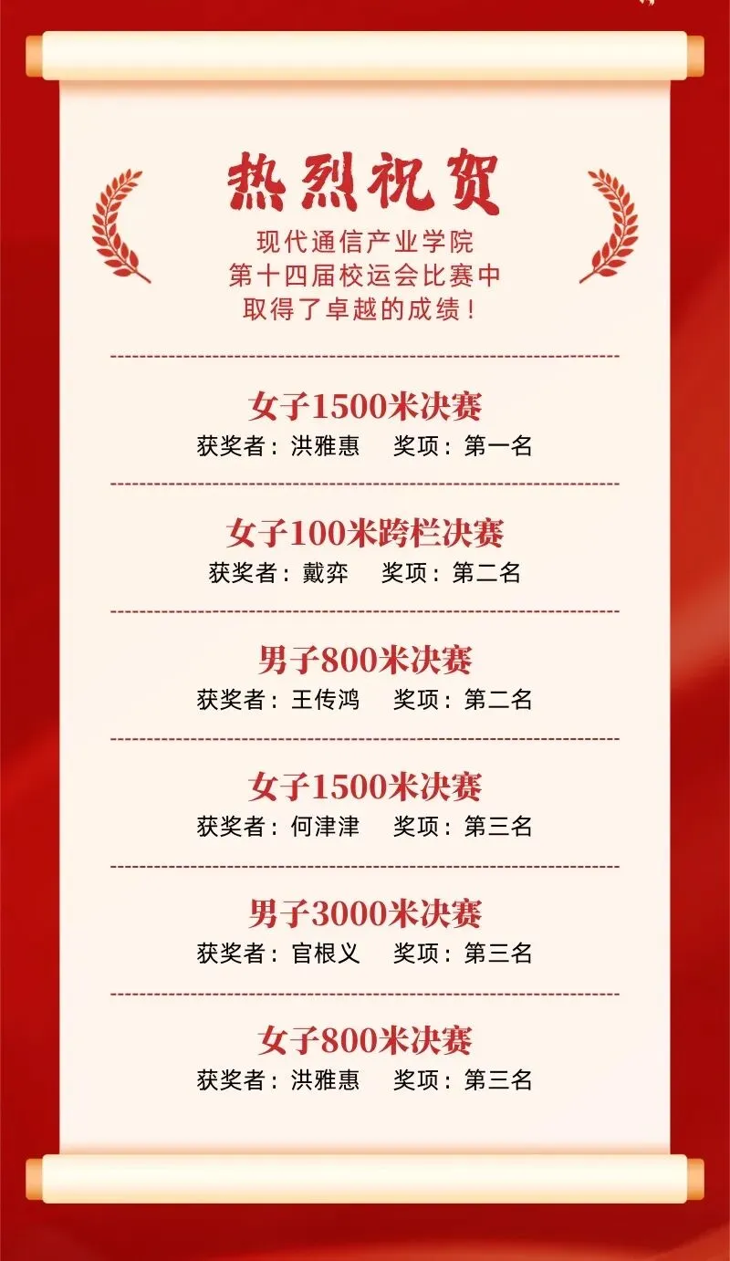 4、我院现代通信产业学院第一代表队洪雅惠奋勇争先、不负韶华,荣获十佳运动员荣誉称号。