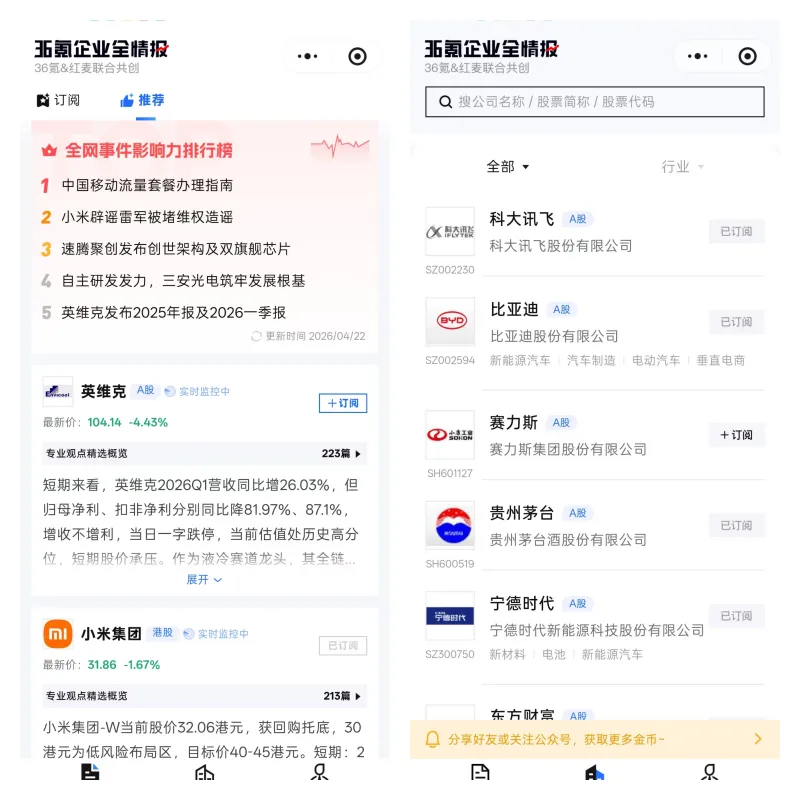 信息爆炸时代,炒股最怕消息滞后、真假难辨、抓不住涨跌核心。刷遍新闻、研报、股吧,仍看不清市场全貌?36氪重磅推出企业全情报微信小程序,以 AI 大模型 + 独家舆情大数据,为普通投资者打造机构级情报工具,一键看透股价逻辑、精准把握投资先机。“36氪企业全情报小程序” 点击直达 →36氪企业全情报