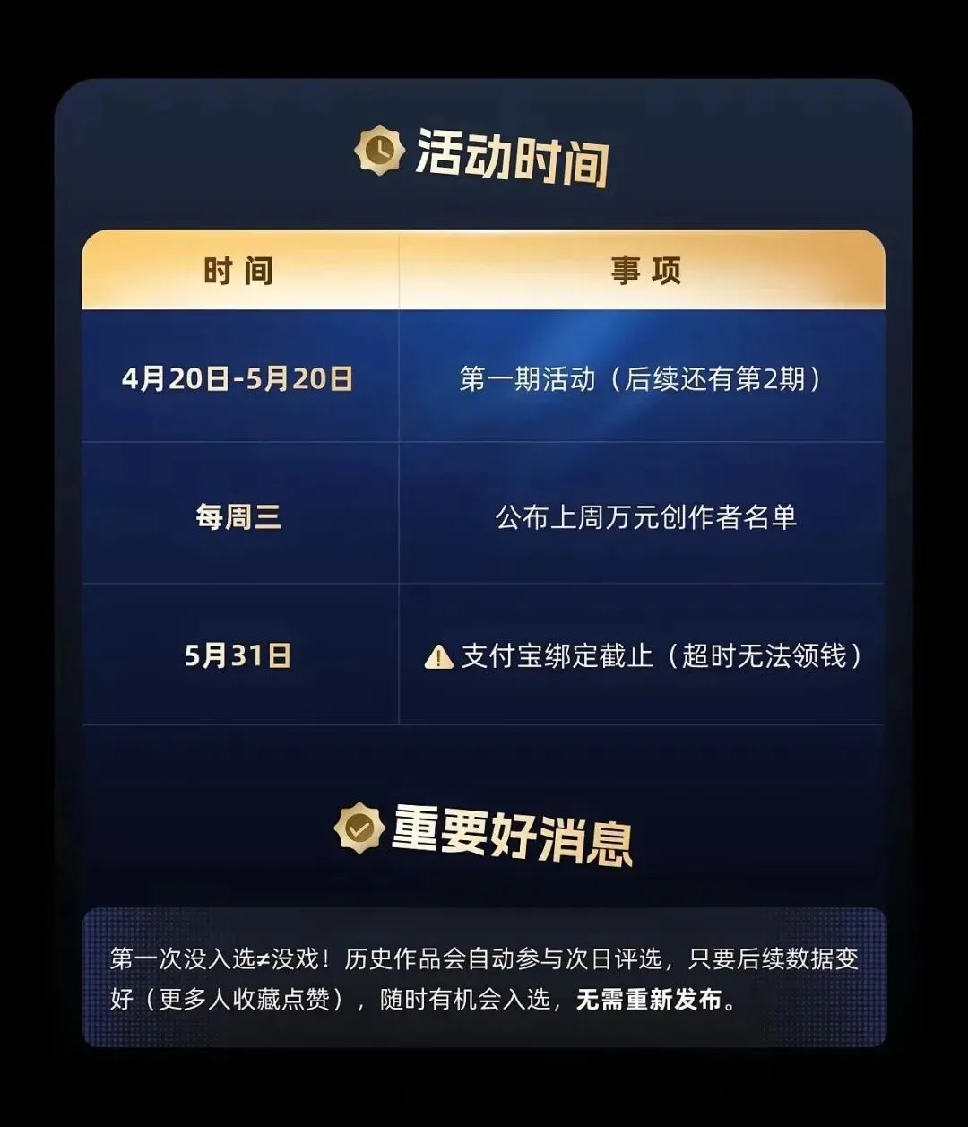 活动时间4月20日-5月20日,第1期活动结束后,后期还有第2期。每周三公布上周万元创作者名单。领取到奖励可以绑定支付宝提现。