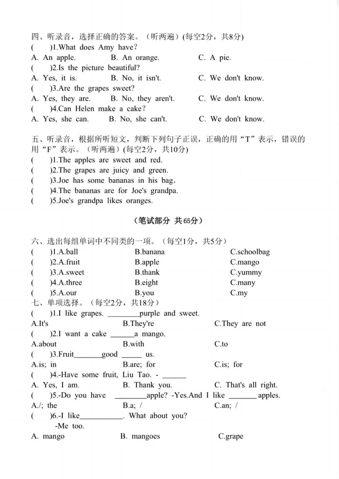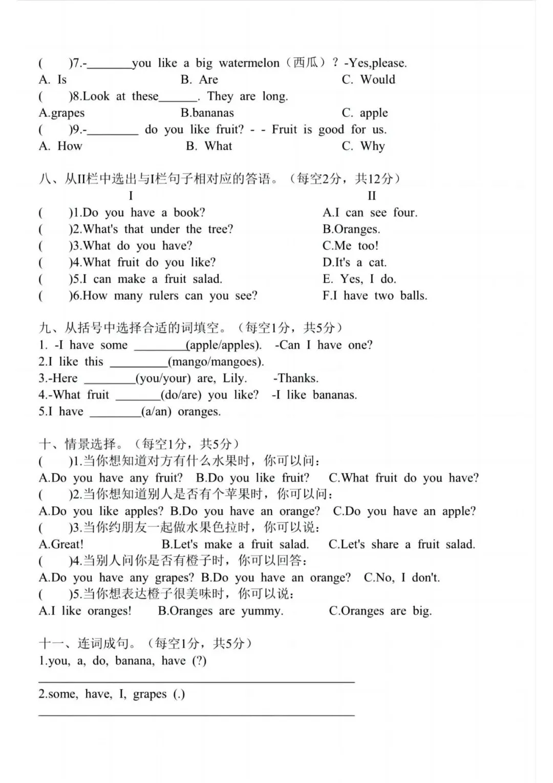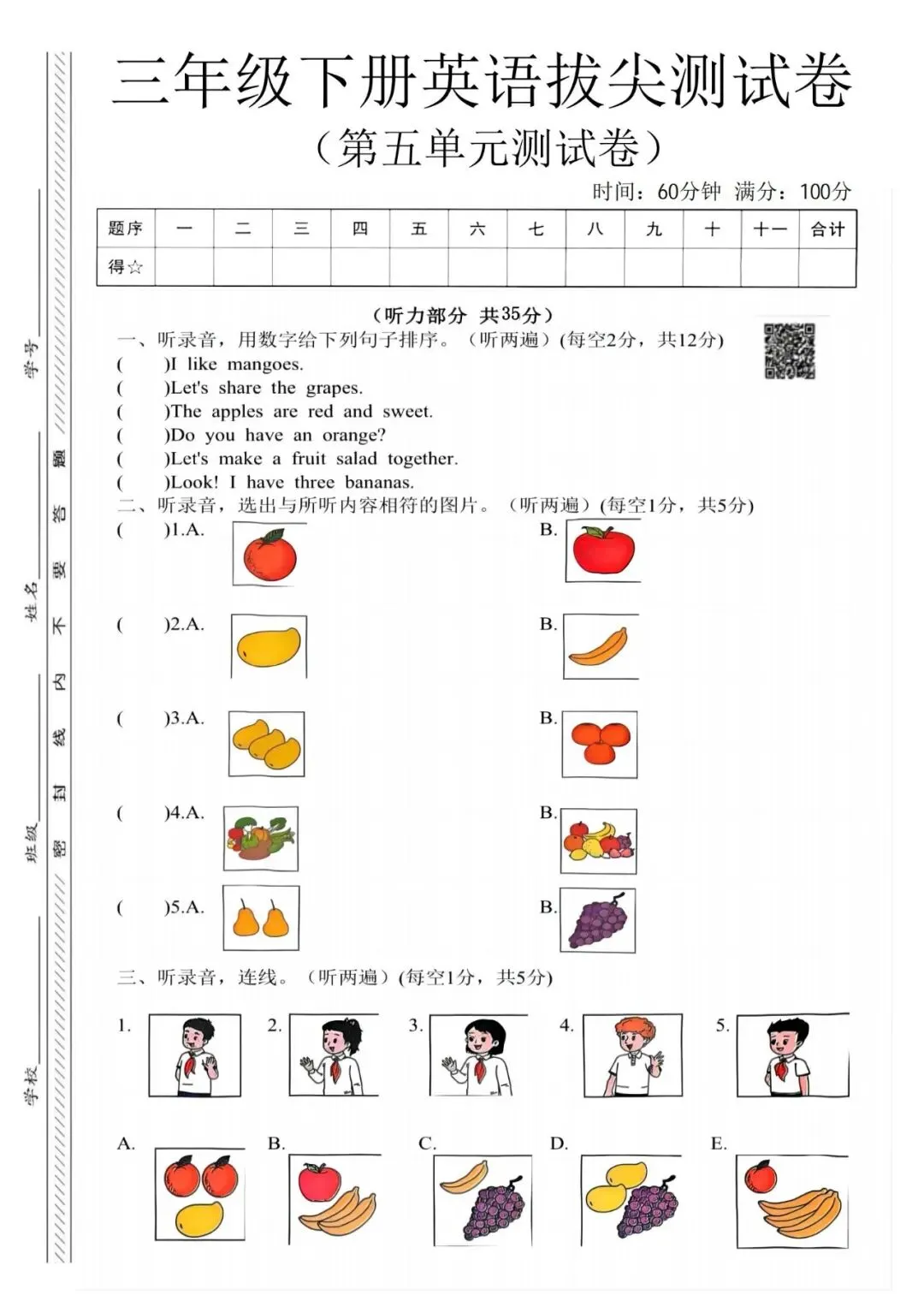 三年级下册英语译林版第五单元测试卷,包含听力、选择、情景对话、连词成句、阅读等题型,全面检测单元知识掌握情况,电子版可打印可下载,需要的家长抓紧打印出来,让孩子练一练吧。