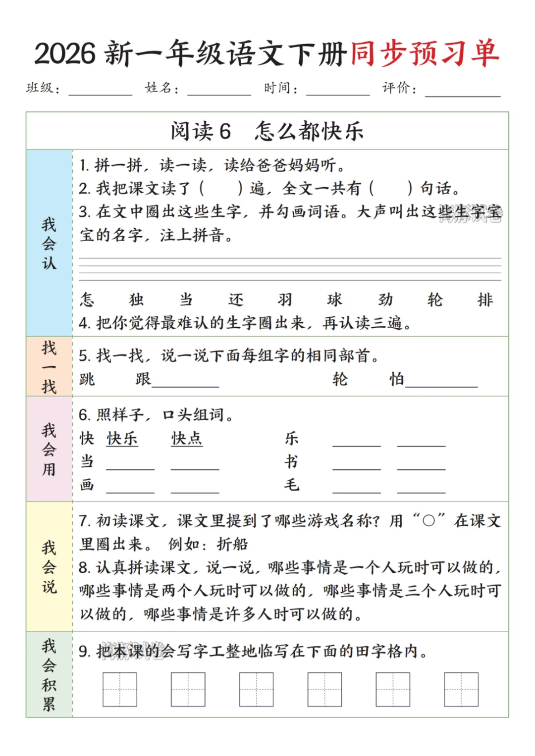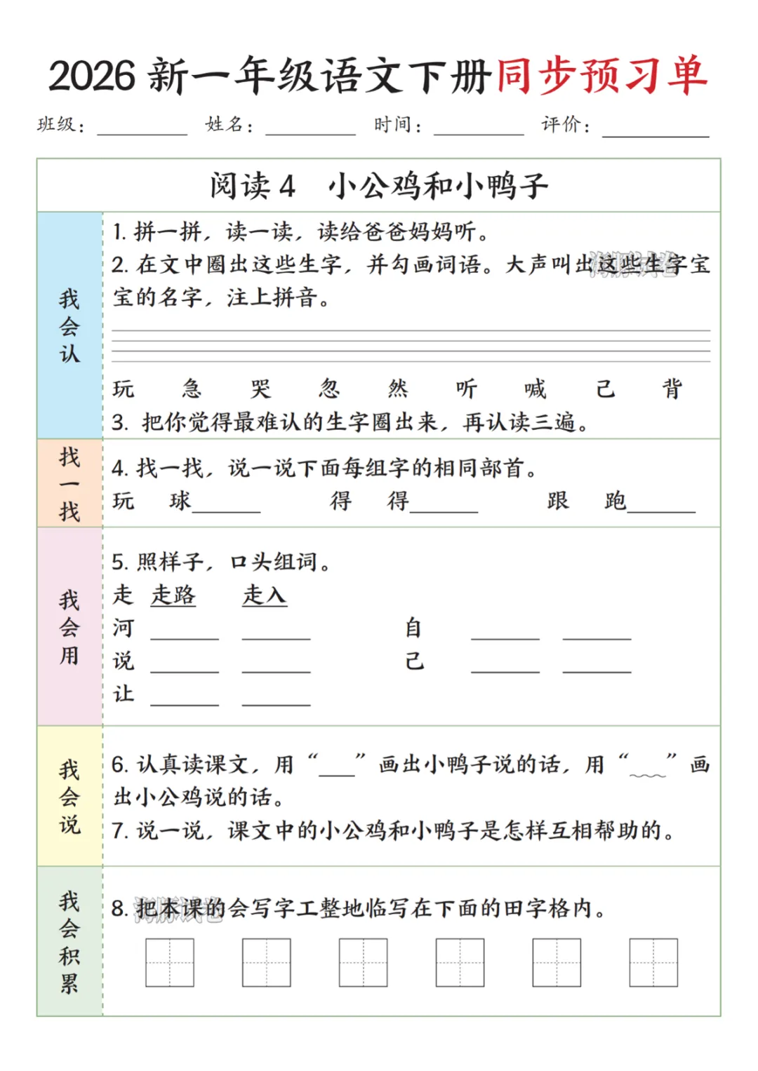 一年级(下)语文三四单元同步预习单 电子版可打印