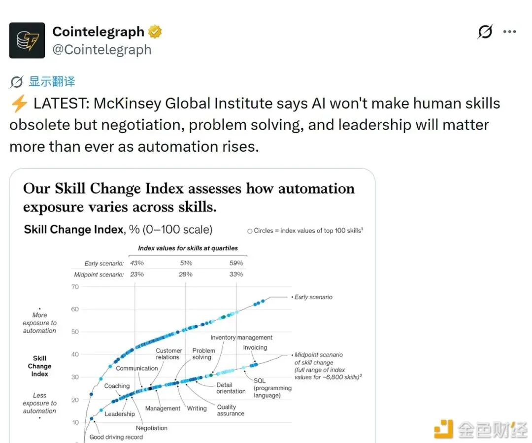 麦肯锡全球研究院表示,人工智能不会让人类技能过时,但随着自动化程度提升,谈判、问题解决与领导力将变得比以往任何时候都更重要。