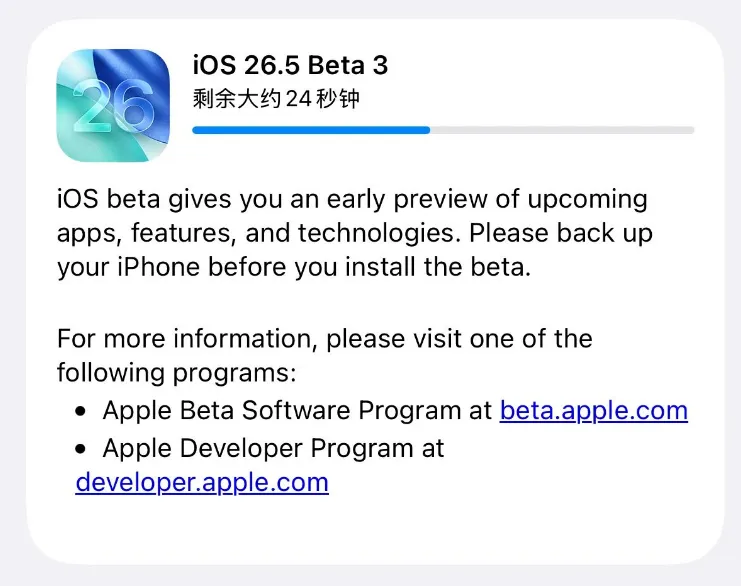 大家好,这里是木木iOS分享。iOS / iPadOS 26.5 开发者预览版 Beta 3 于 2026 年 4 月 21 日推送(内部版本号 23F5059e),距离上次 Beta 2 仅隔 7 天。根据目前的信息,这次更新没有引入全新的重磅功能,主要是对已有特性的持续测试和系统稳定性的提升。