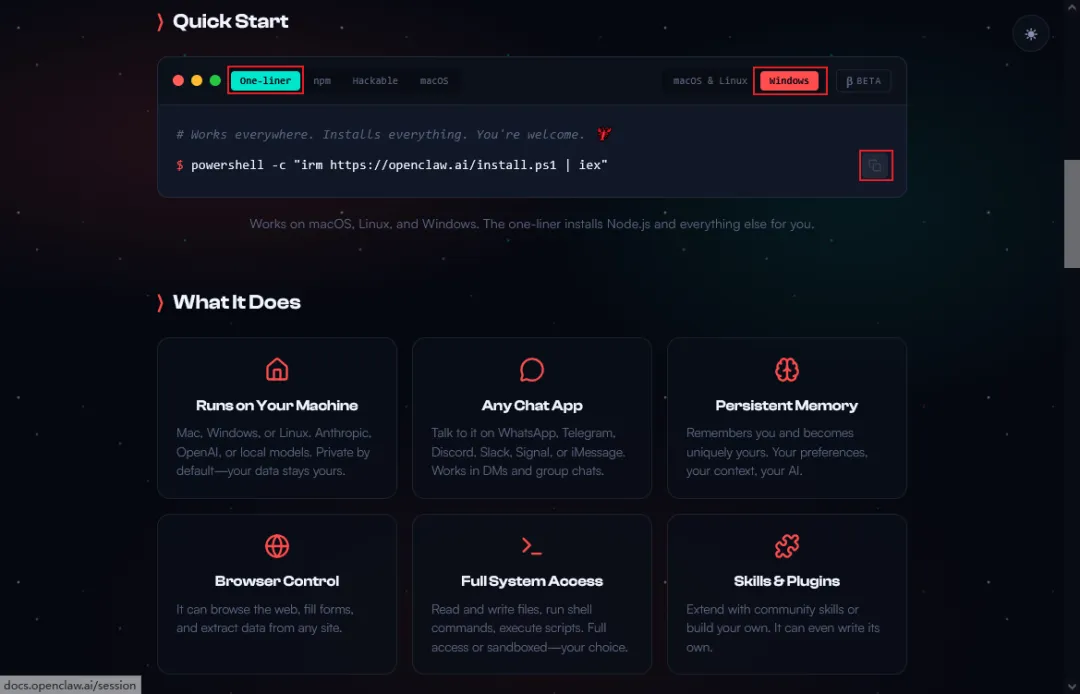 Step1:浏览器访问网址https://openclaw.ai/,打开”OpenClaw”的官网,在页面中找到”Quick Start”导航栏,依次选择”one-liner”–>”windows”,复制下载安装命令,如果是使用苹果设备的用户则复制macOS下的安装命令。