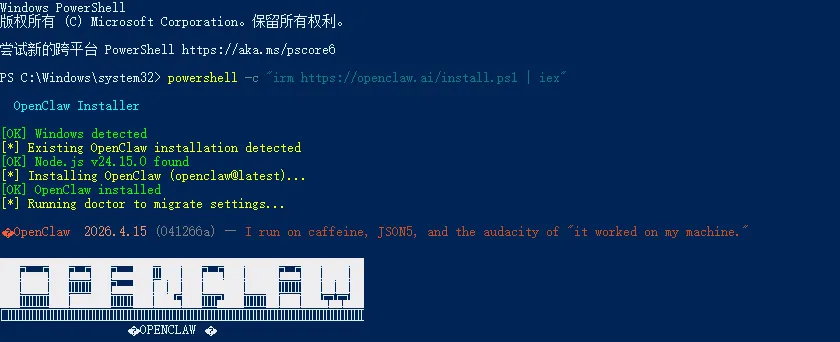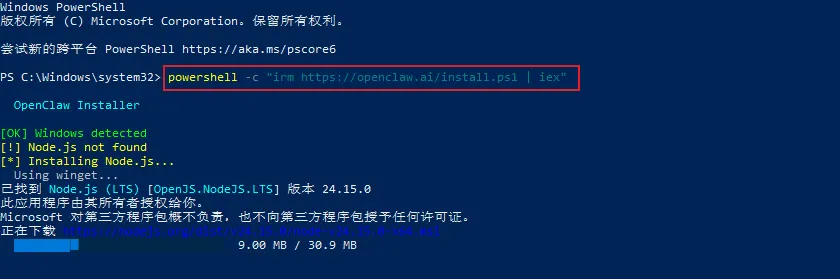 Step2:打开我的电脑上系统自带的”PowerShell”工具,鼠标右键粘贴刚刚复制的命令,按回车键后就会自动帮我安装node.js依赖工具和OpenClaw,我需要做的就是等待它安装完成即可。