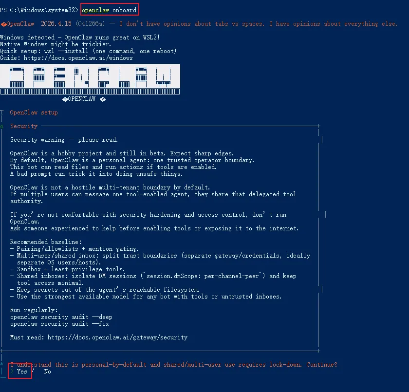 Step1:等待OpenClaw安装完成后,我需要对它进行初始化的配置。输入命令行”openclaw onboard”,按回车键后会启动配置向导,我按提示一步一步操作即可,首先出现的是一个安全提示说明,我选择”Yes”才能继续配置,通过键盘的左右方向键进行选择。