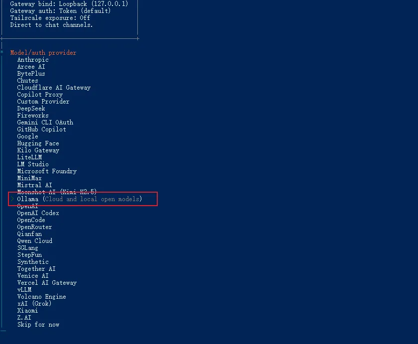 Step3:接下来的这一步比较关键,就是需要我选择一个提供服务的模型,如果选择使用云端模型,比如Qwen、DeepSeek等服务商,则需要我已经获取了API密钥。这个时候果断选择”Ollama”选项,前提是我电脑上已经安装了大模型,如果没有安装或不清楚怎么安装的话,请移步阅读:我通过Ollama部署了自己的本地大模型,选择好后按回车键继续。