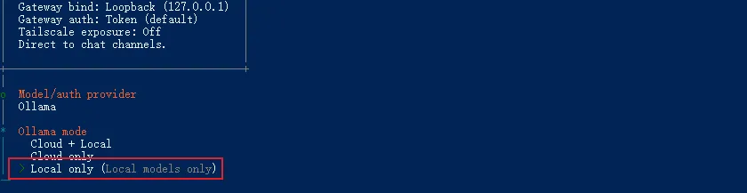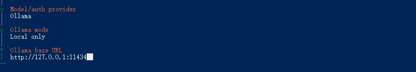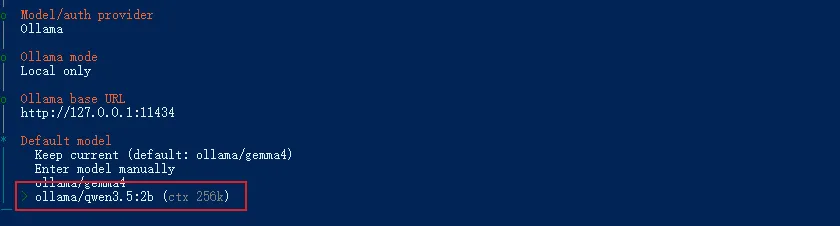 Step4:接下来会出现Ollama模型选择和服务器地址,”Ollama mode”选择”Local only”,默认模型选择我已经安装好的”qwen3.5:2b”。
