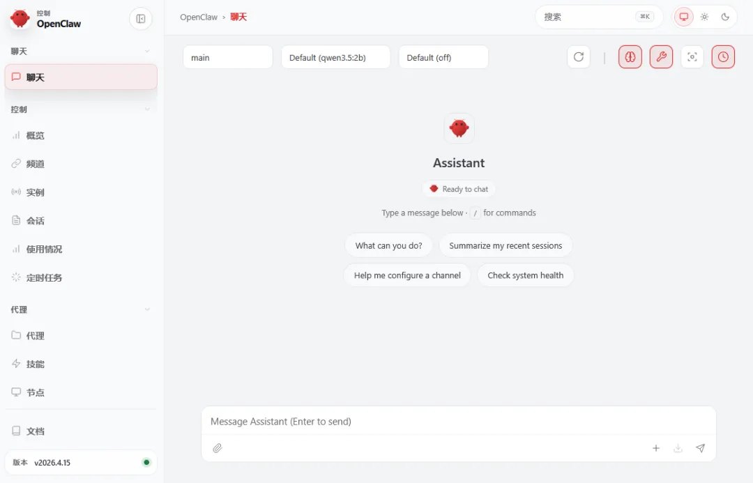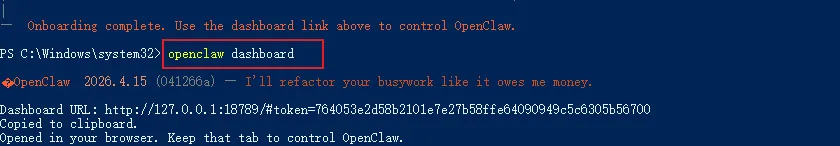 Step1:在配置完成后,系统会自动调起网关服务,这时我在命令行输入”openclaw dashboard”后,会出现一个访问OpenClaw控制界面的URL地址,我复制这个URL地址在浏览器打开,就会看到OpenClaw的交互界面。
