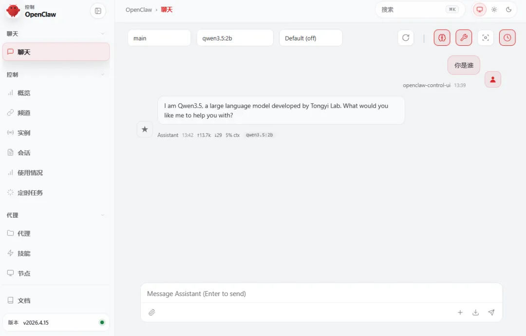 Step2:在OpenClaw的交互界面中,我可以和它对话,看到它有回应,则表明我的龙虾安装配置成功了。
