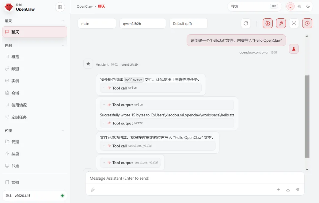Step3:接下来我再试试龙虾的动手能力,看看是不是真的能执行我给它的任务,我想让它创建一个”hello.txt”文件,内容写入”Hello OpenClaw”。