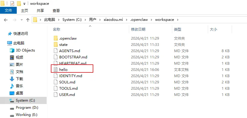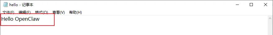 Step4:等待了几分钟后,龙虾回复已经创建好了文件,我到它说的目录下看看。确实按我的要求创建了一个”hello.txt”文件并写了”Hello OpenClaw”内容。