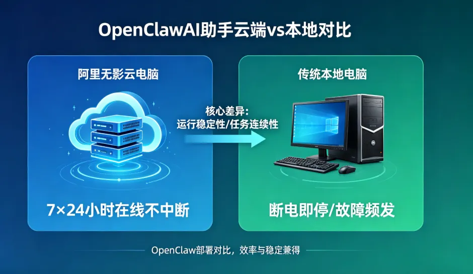 无影云电脑OpenClaw vs 传统电脑OpenClaw:稳定性天差地别,效率直接拉满,还在为本地电脑跑OpenClaw频繁掉线、任务中断而头疼?同样是用OpenClawAI助手,部署在阿里无影云电脑和传统本地电脑上,运行稳定性、任务连续性有着本质差距——云端7×24小时在线不中断,本地断电即停、故障频发,核心差异一文说透!