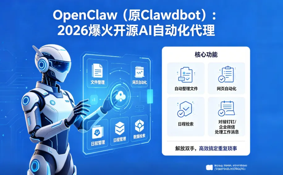 OpenClaw(原Clawdbot)是2026年爆火的开源AI自动化代理,不是普通聊天机器人,而是能实际执行任务的“数字员工”:帮你自动整理文件、网页自动化、日程管理、数据检索,甚至对接钉钉/企业微信自动处理工作消息,解放双手、高效搞定重复琐事。