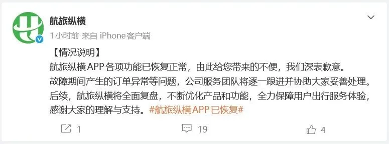 崩了19小时后,航旅纵横致歉:APP功能恢复正常,故障期间产生的订单异常等问题将逐一协助处理|消费关注