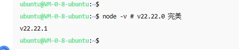 curl -o- https://raw.githubusercontent.com/nvm-sh/nvm/v0.40.3/install.sh | bashsource ~/.bashrcnvm install 22nvm use 22node -v# 输出:v22.22.0npm -v# 输出:10.x.x