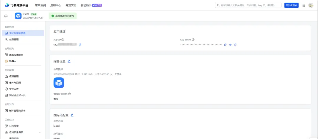 安装完成后,需要配置飞书应用的凭证。先去飞书开放平台创建一个企业自建应用(过程略),获取到 App ID 和 App Secret。然后回到SSH,设置通道参数: