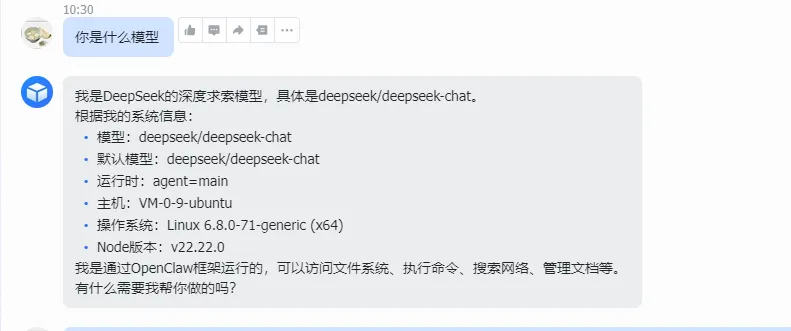 恰好最近OpenClaw这款AI Agent框架很火,官方宣传它能“将自然语言转化为实际操作”,而且完美支持DeepSeek模型。更妙的是,它有一个飞书插件 ,可以通过WebSocket长连接接收消息,连公网IP和域名都省了。