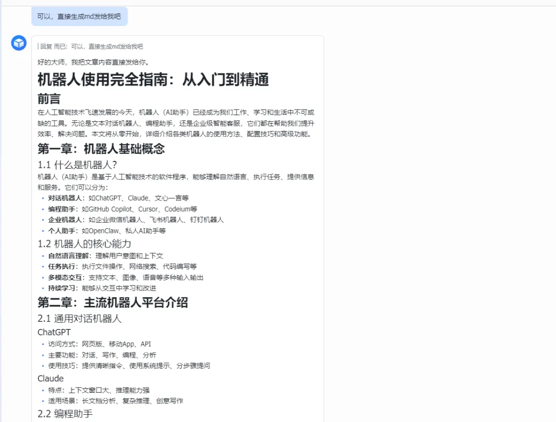 等待了大约3秒钟(这是模型API调用的正常延迟),机器人回复了: