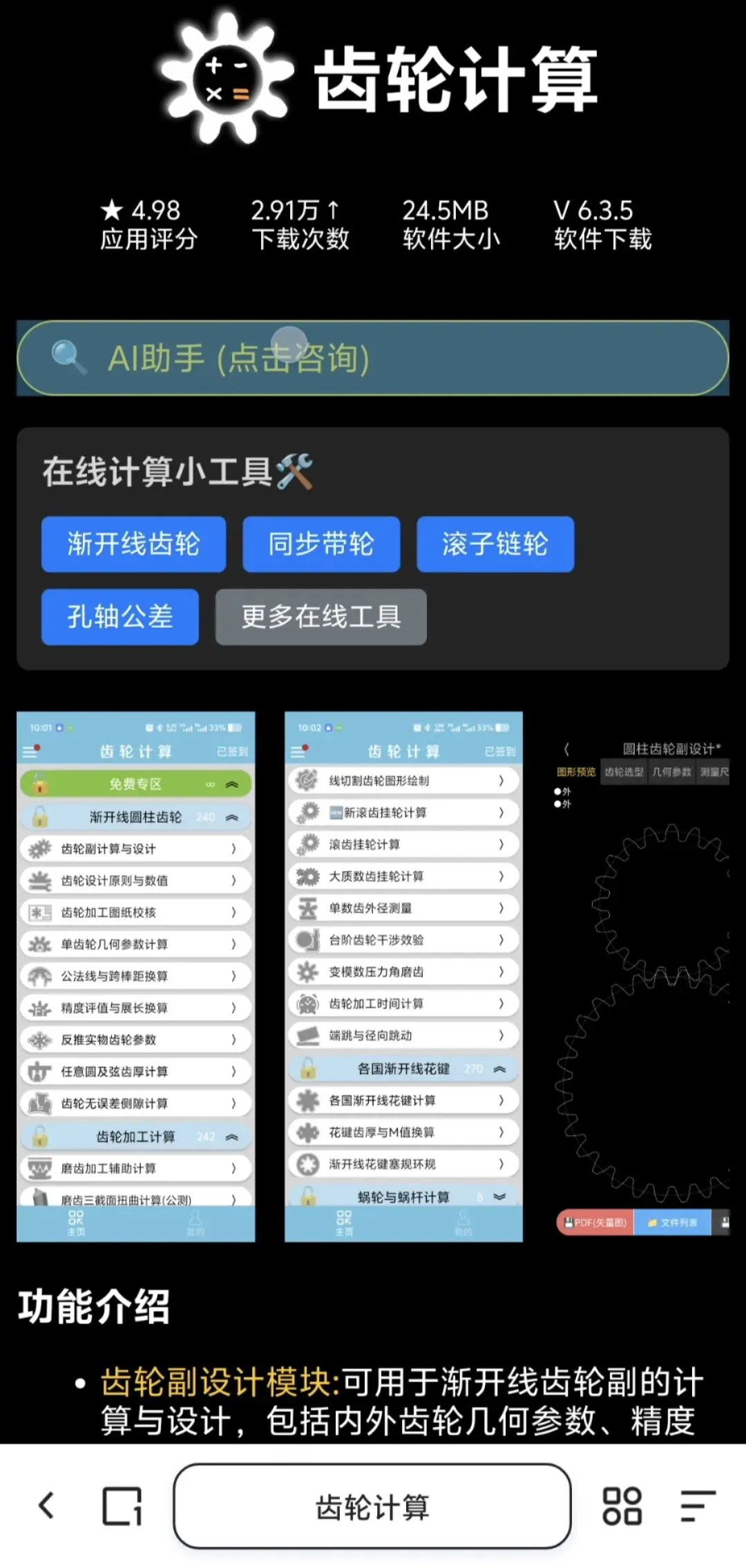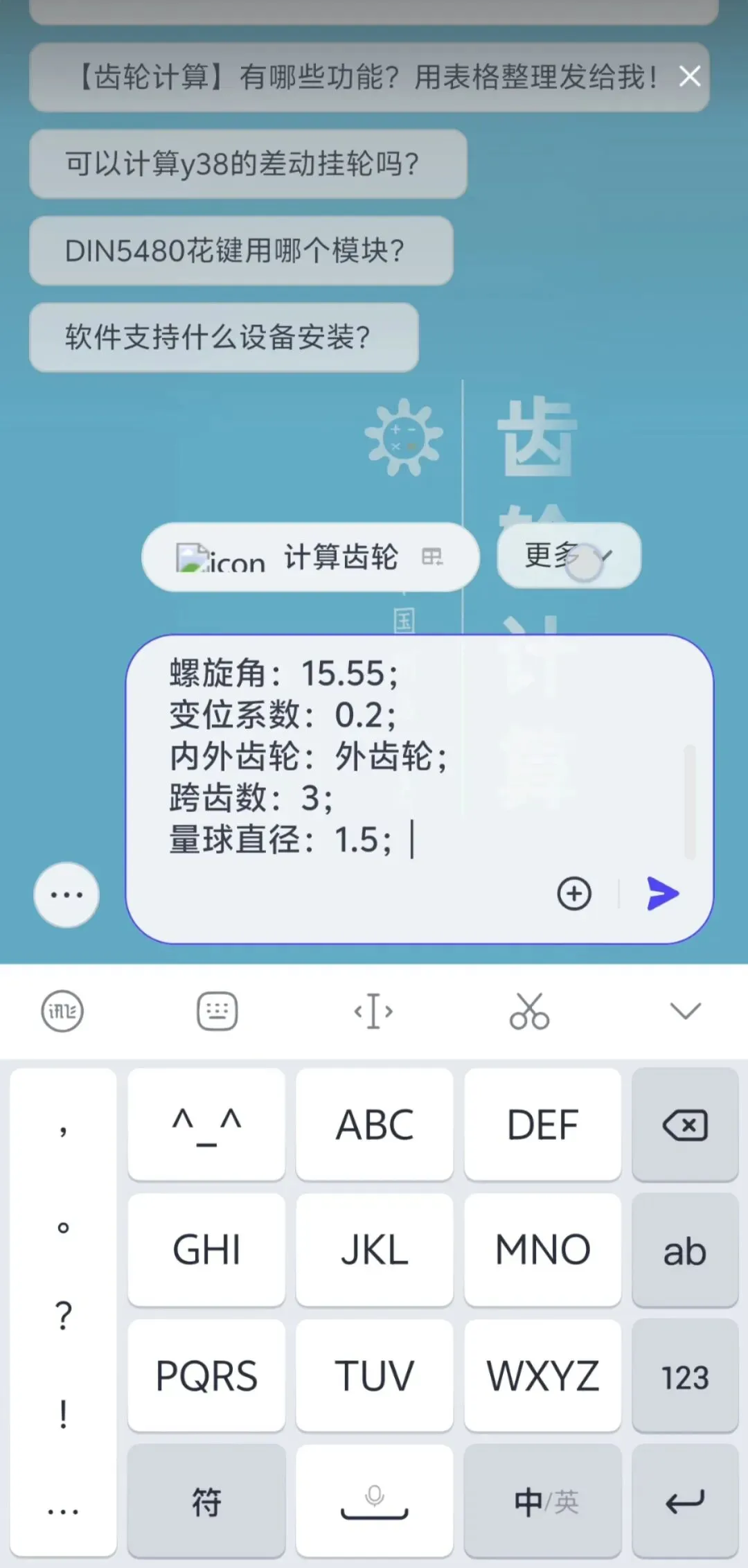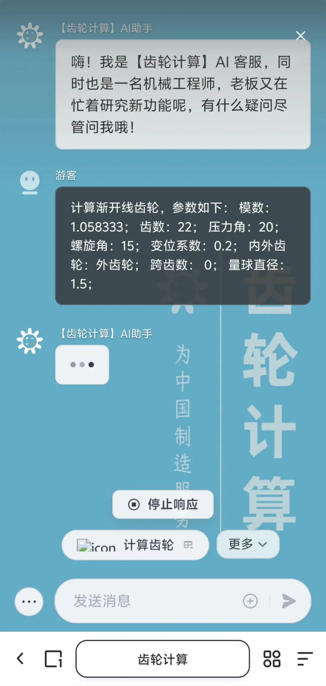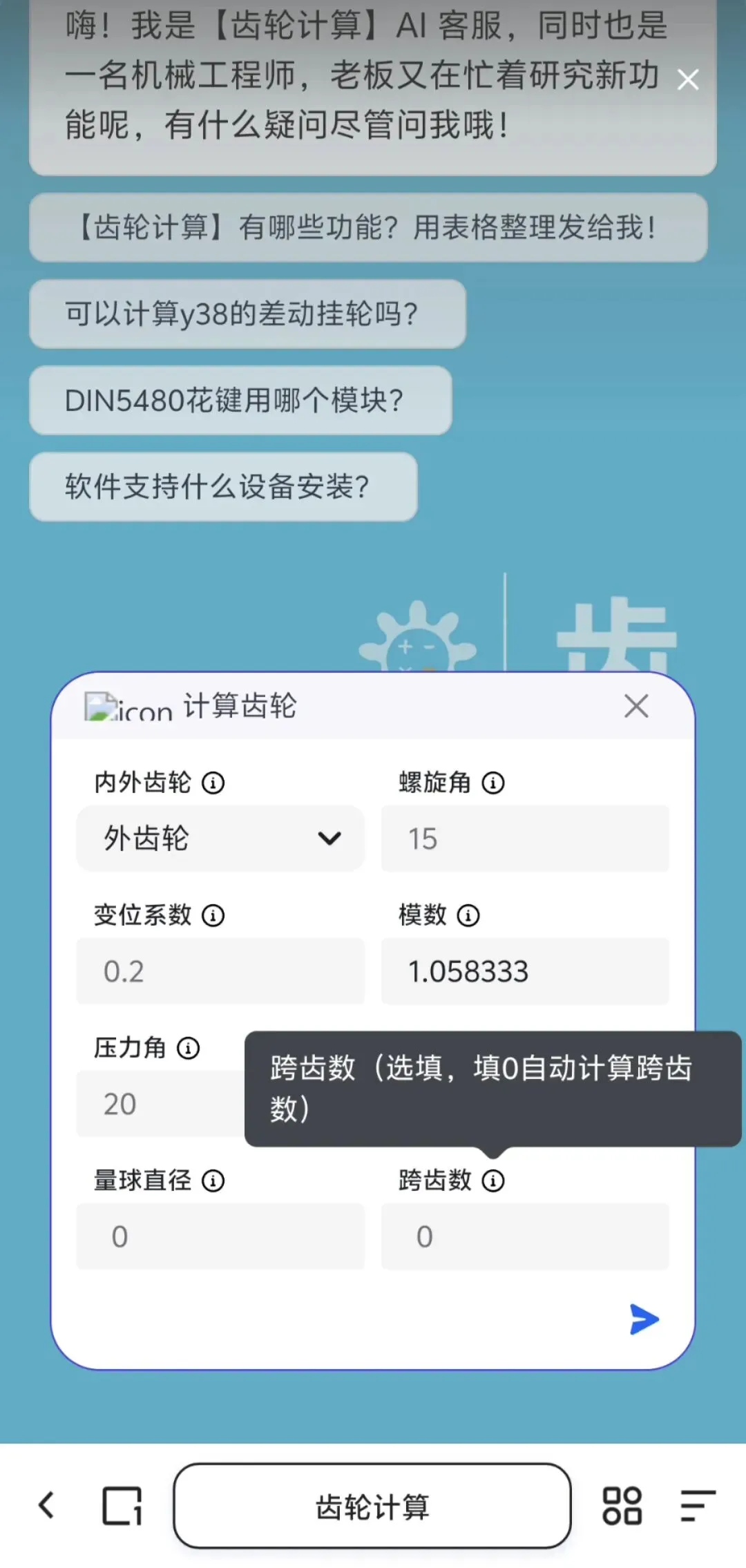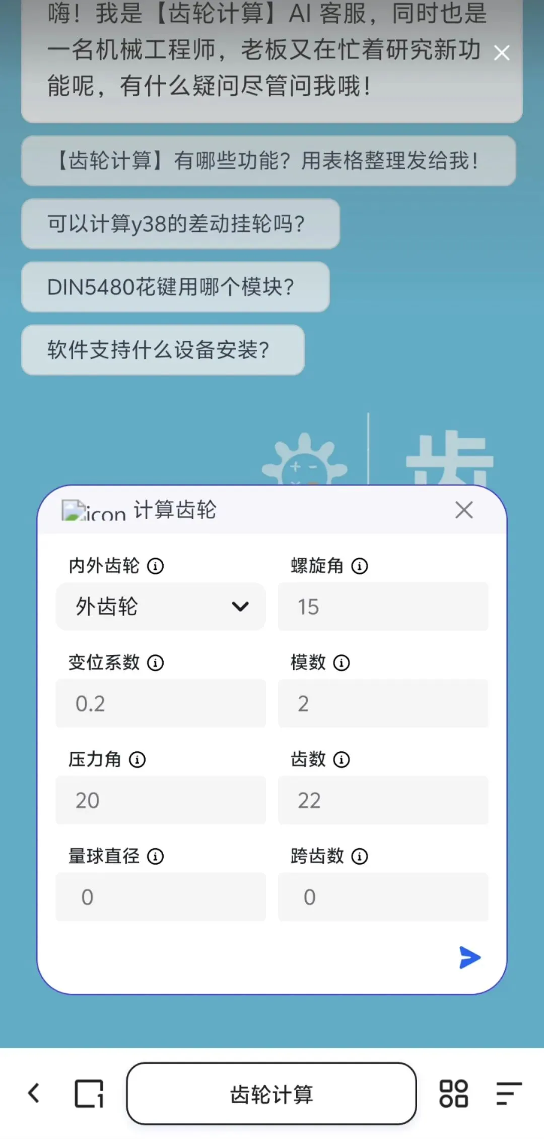 直接进入正题,打开齿轮计算AI助手,我们有两种方式计算齿轮参数,第一种是直接输入自然语言告诉ai助手你要计算什么参数,这种方法必须保证你给定的参数齐全,不太稳定。