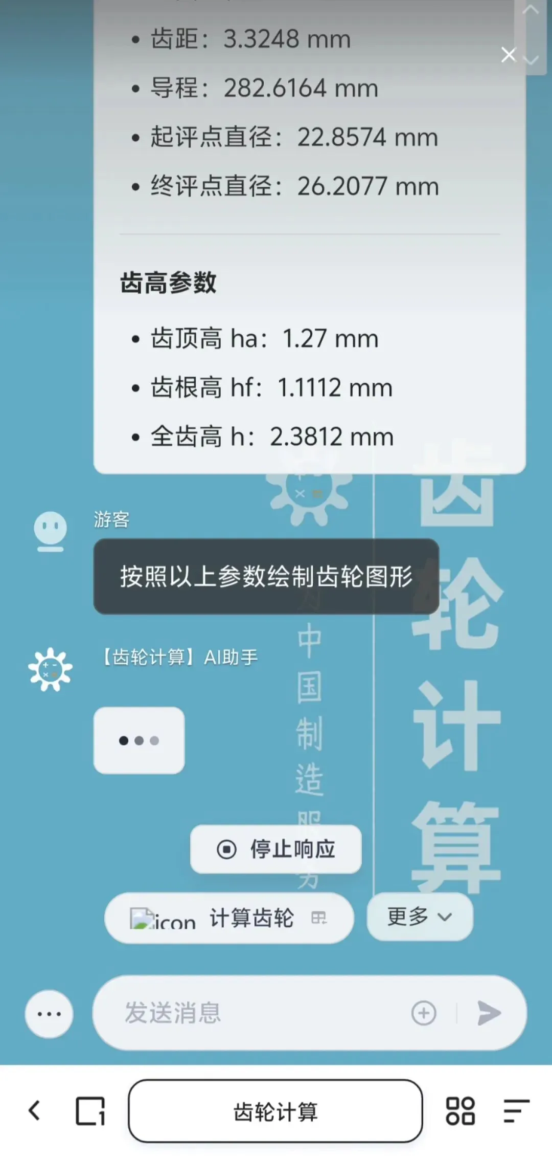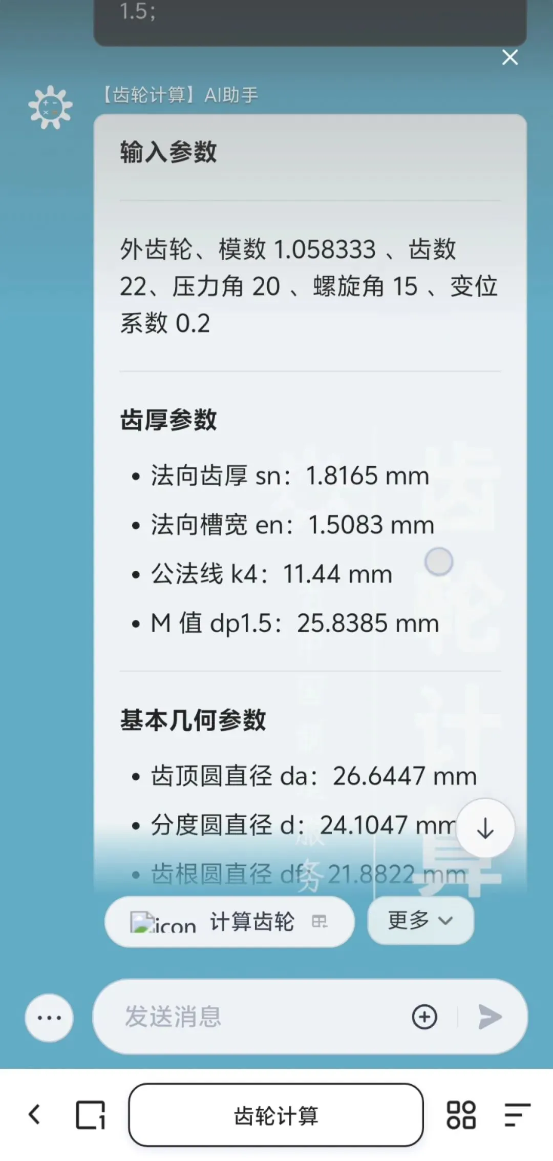 AI会根据这些参数调用我们内置开发的工具去计算渐开线齿轮,输出结果相对来说还是比较全面的,可以看到他自己计算的跨齿数是4,然后根据我们指定的量球直径1.5计算的对应跨棒距是25.9018,然后下面还有一些几何参数结果。