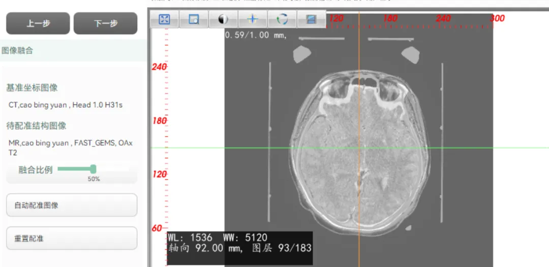 导入多个序列,可对图像进行一键融合,生成融合序列,如:进行CT、磁共振融合,设定融合比例,可对CT或磁共振显示的权重进行调整。
