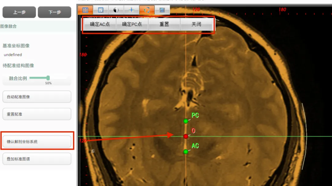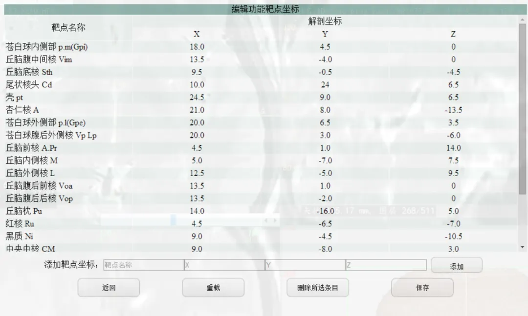 可以通过确定AC、PC点,构建解剖坐标系,进行功能性手术,并且本软件内置常用功能靶点坐标,具体坐标数值可根据医生的经验进行编辑调整,构建好解剖坐标系后,在手术规划中,即可调用功能靶点。