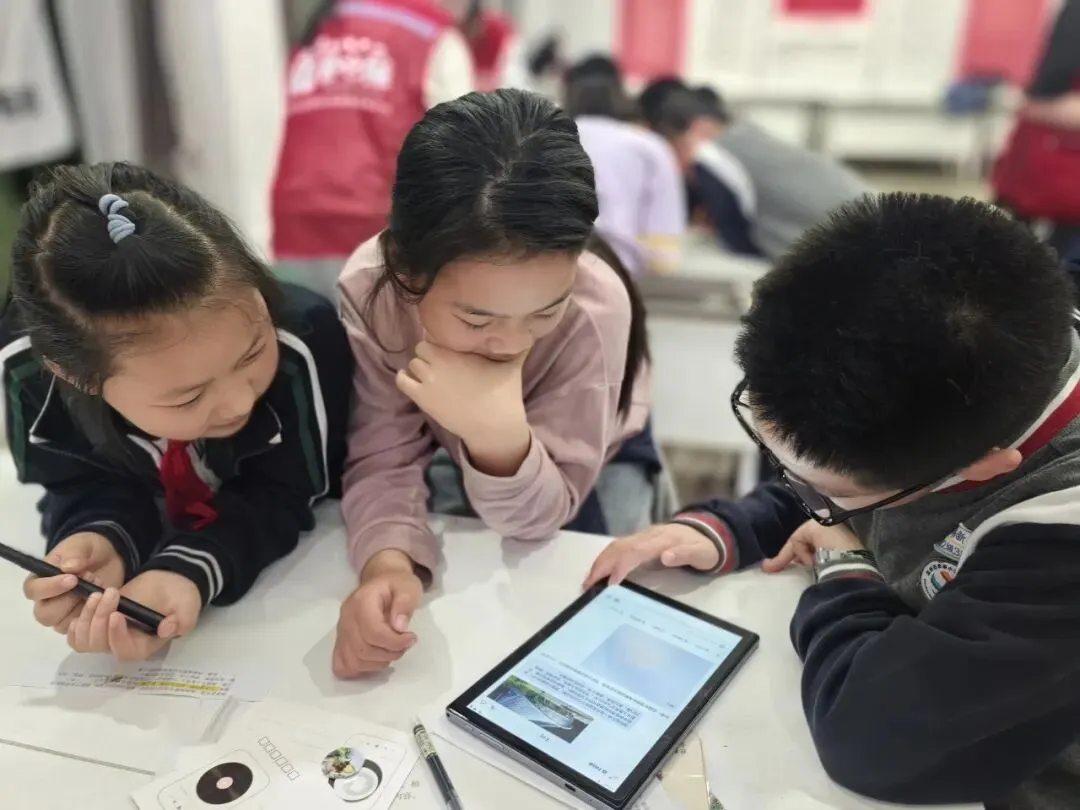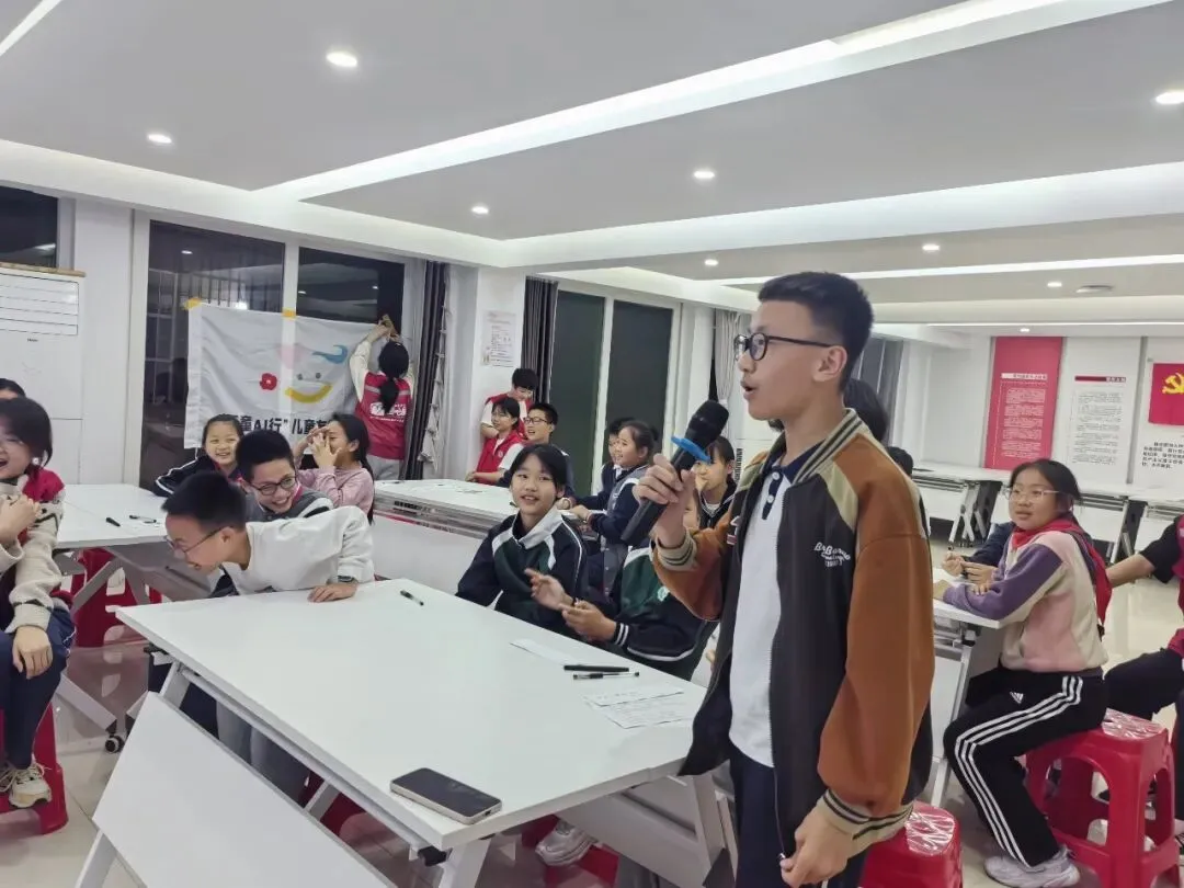 实践操作环节将创意推向高潮。孩子们分成3-4人一组,设有千问组、豆包组等四个小组,每组配备2名大学生志愿者协助。宣讲老师首先指导孩子们完成邀请函文字——向亲友发出共飨盛会的邀请,表达共迎园博的美好心愿。接着,孩子们借助AI工具,将园博元素与个人创意相结合,设计出独属于自己的邮票,图案天马行空。随后,各小组以园博特色主题展园为灵感,合作创作一首园博主题歌曲。经过热烈讨论与全班投票表决,一首欢快节奏的旋律脱颖而出,成为大家共同录制在卡片里的“园博之声”。最后,孩子们亲手将CD卡和自制的AI邮票张贴到邀请函与明信片上,一件件独一无二的作品跃然眼前。大家纷纷举起成果合影留念,并表示要带回家与父母一起欣赏。