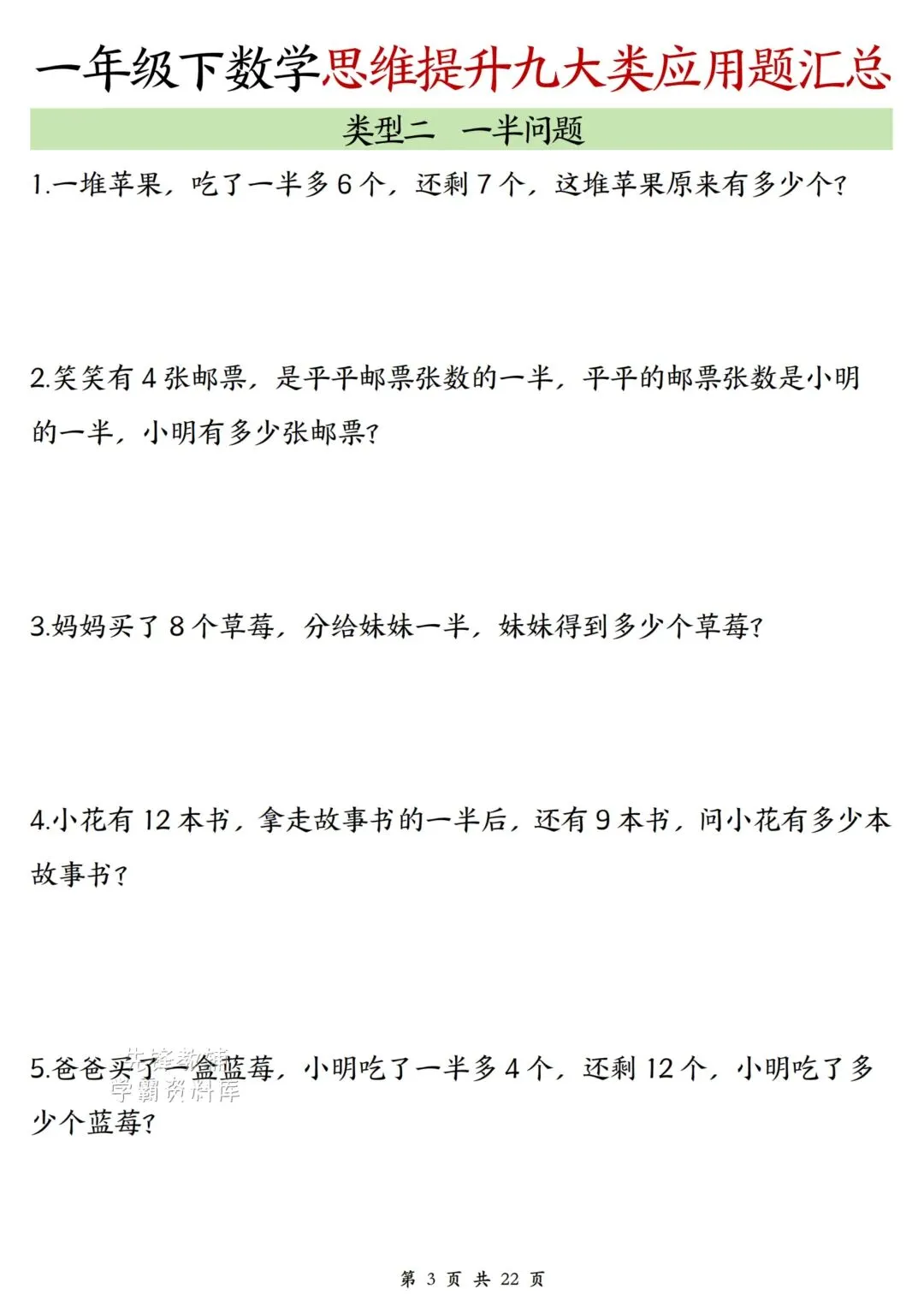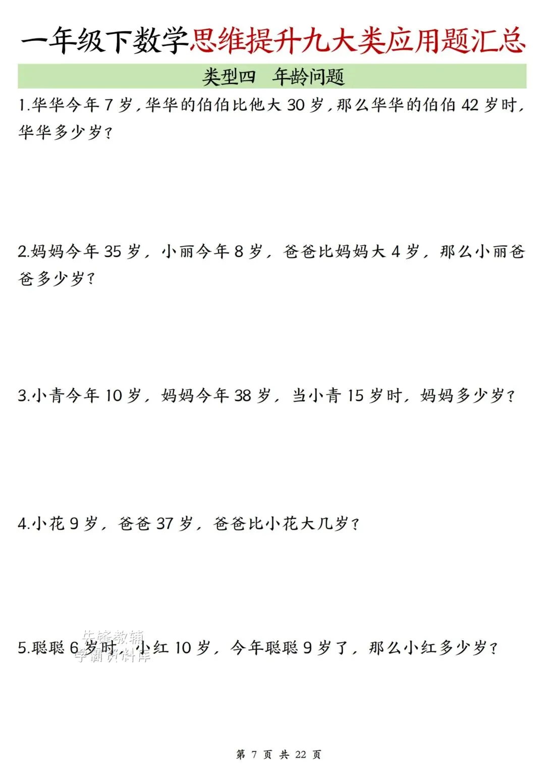 家长朋友们是否为孩子学习发愁?别担心《一年级数学下册思维提升九大类应用题汇总》来助力。根据册历年真题编制,题型经典,有一定难度,家长朋友们收藏打印出来让孩子做一做,及时查缺补漏。自信上考场 !