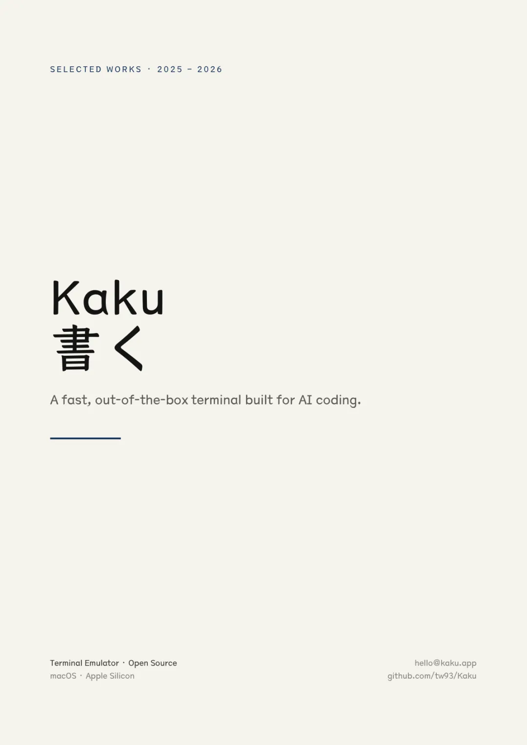 書く Kaku — 你写代码的方式(AI 编程终端)技 Waza — 你反复操练的习惯(工程实践 Skill 集)紙 Kami — 你的交付物落地的纸面(文档设计系统)