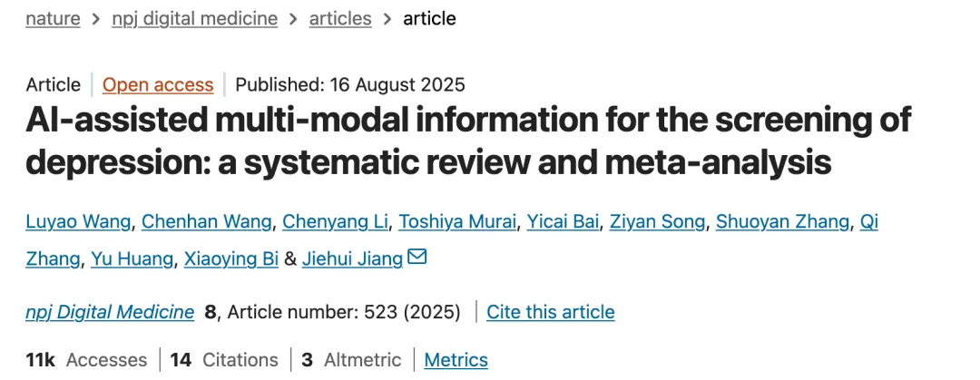 Wang L, Wang C, Li C, et al. AI-assisted multi-modal information for the screening of depression: a systematic review and meta-analysis. npj Digital Medicine. 2025;8:523. Published 16 August 2025. DOI: 10.1038/s41746-025-01933-3.