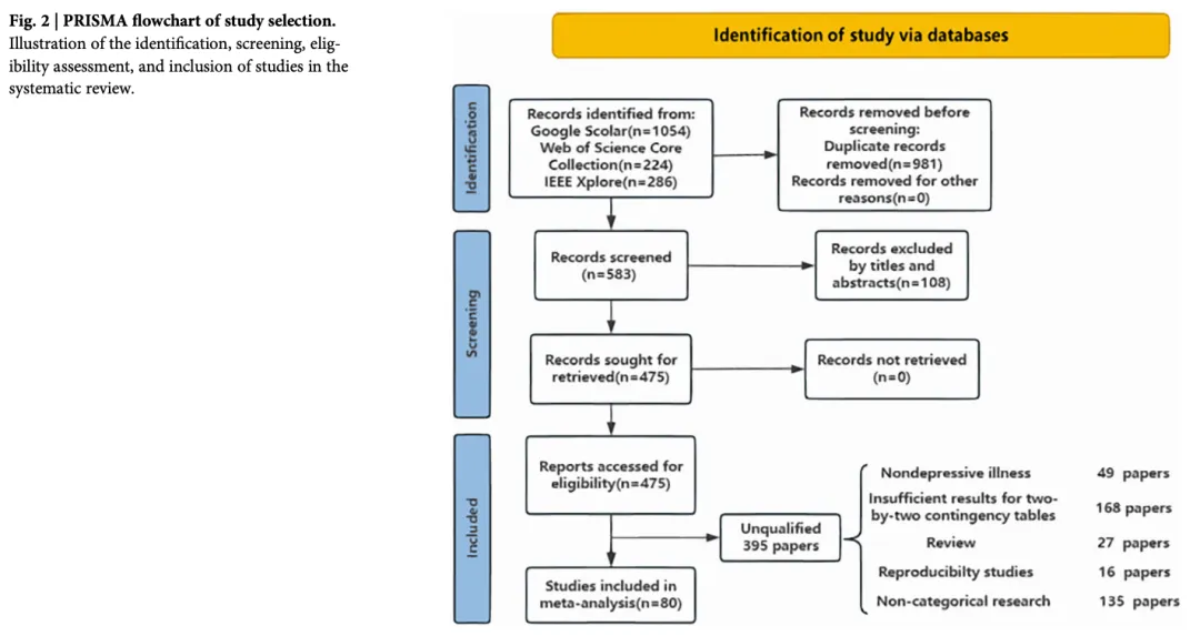 这项研究采用了系统综述和Meta分析方法,并按 PRISMA 标准执行,同时在 PROSPERO 完成注册。作者检索了 Google Scholar、Web of Science 和 IEEE Xplore,检索截止日期为 2025年6月7日。纳入标准要求研究必须使用 AI 方法,对抑郁与正常对照进行分类,并报告足以计算 2×2 列联表的数据,也就是敏感度、特异度等指标。