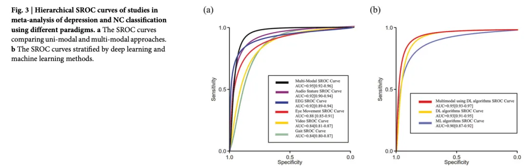 这是全文最核心的结果。论文摘要直接给出,多模态 AI 方法的合并 AUC 为 0.95(95% CI: 0.92–0.96),明显优于单模态方法,而单模态方法的合并 AUC 大约落在 0.84–0.92 之间。作者据此认为,多模态融合确实能带来更强的抑郁筛查能力。