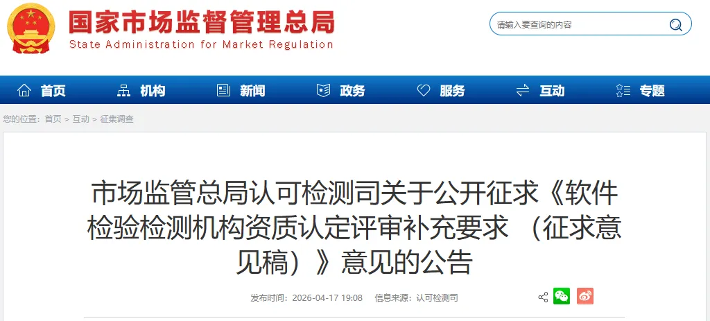市场监管总局认可检测司关于公开征求《软件检验检测机构资质认定评审补充要求 (征求意见稿)》意见的公告