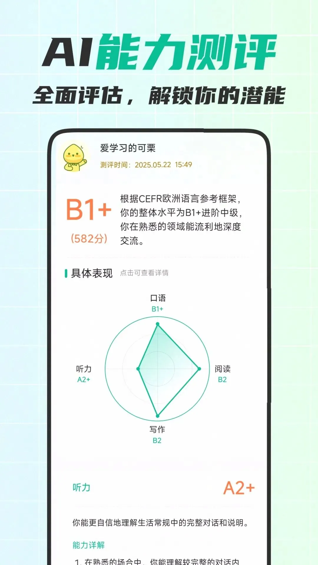 外贸人跟单、出差连轴转,哪有整块时间学英语?可栗口语会根据你的英语水平(CEFR标准从A0到C2精准测评)和外贸目标,自动生成每日10分钟以内的学习计划,跟单间隙、出差路上就能练,效率比盲目背单词高5倍。