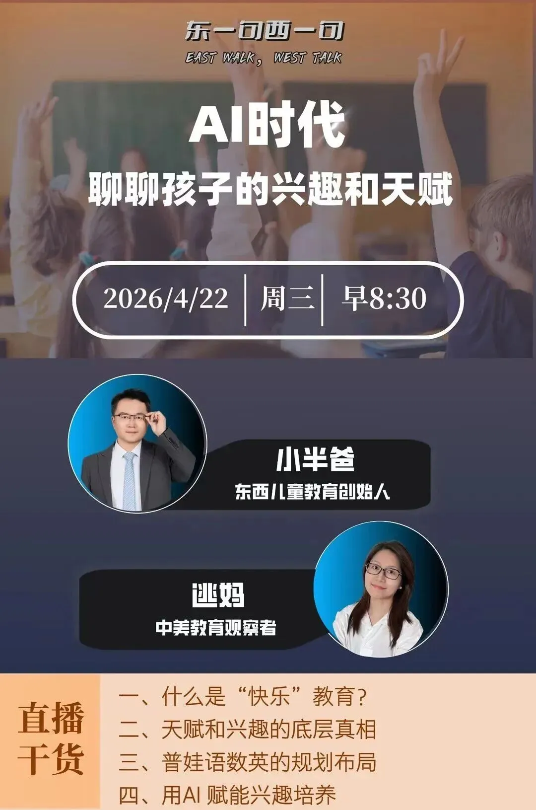 本次直播为AI教育系列分享收官之作,围绕美国K12快乐教育观察、天赋与兴趣的关系、小学语数英核心规划、AI助力兴趣培养四大模块展开,结合一线观察与名师观点,为普通家庭提供了务实可落地的教育思路。