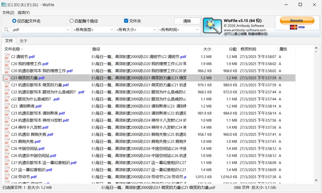 【软件介绍】WizFile直接读NTFS的MFT,支持NTFS本地盘、FAT32/exFAT/USB/网络共享(非 NTFS 速度稍慢),跳过系统API,首次启动几秒内完成全盘索引,输入即出结果,支持文件名、完整路径、大小区间、日期区间搜索,预设文件类型、大小、日期三类可自定义筛选;后台监控文件增删改,结果自动刷新,无需手动重建索引;轻量无数据库:数据全在内存,不写本地数据库文件,便携、不占磁盘、启动快;低资源占用:硬件占用极低,比同类工具更省内存;多条件搜索:按文件名/完整路径、大小、修改/创建日期筛选;支持通配符*/?、空格 (AND)、|(OR) 多关键词组合。