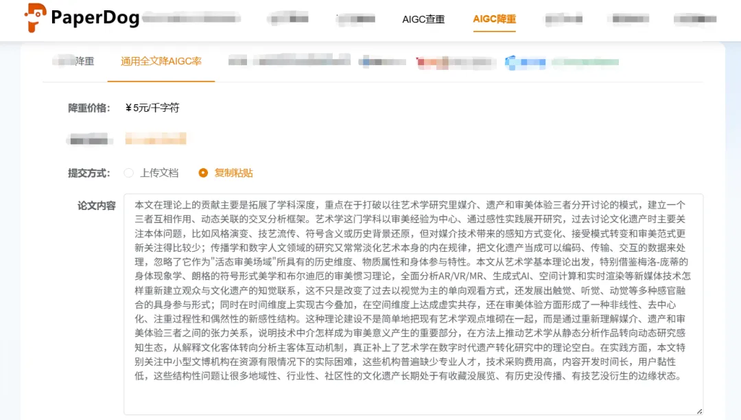 实战体验:这家的一个功能是每天提供一次免费查重的机会,对于预算不太充足的同学来说,能省一次查重的预算。它的基础降AI能力是在线的,价格大约3.5元/千字。