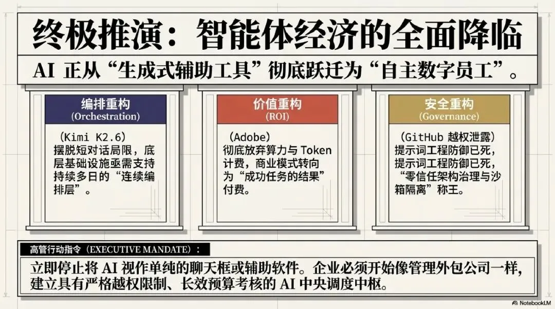 互联网从业者:警惕“ Agent 漏洞”带来的系统性安全崩塌。当 AI 编程助手因简单注入就泄露 API 密钥时 ,传统的安全防护逻辑已经失效。从业者需关注 Kimi K2.6 等长程任务对调度层的极端挑战 。此外,中国开源大模型正通过提供“开源权重”包,绕过 API 限制重塑全球格局 ,这是本地化部署与微调的黄金期。
