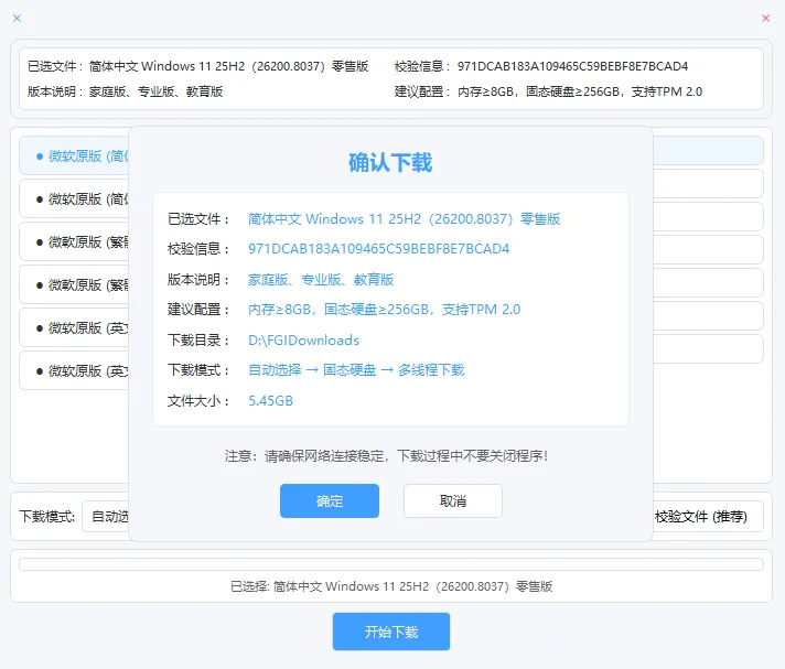 操作也简单,选好你需要的系统版本,点一下「开始下载」,再确认一次,下载就自动启动了。