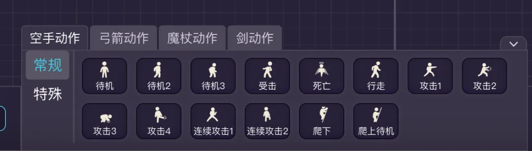 待机、攻击、跳跃、射击、挥剑砍杀、跳砍杀、爬上爬上。。。